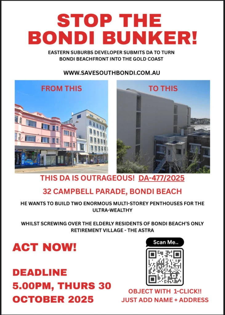 A grassroots campaign, Save South Bondi, has emerged to coordinate community objections. The group’s website says the project breaches local height limits, risks overshadowing residents, and urges locals to email Waverley Council to oppose the “20-metre wall of concrete.”
