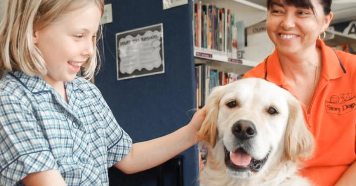 The Story Dogs program operates across Australia, placing trained dogs and volunteer handlers in schools to support children who may feel anxious reading aloud or who need additional encouragement.